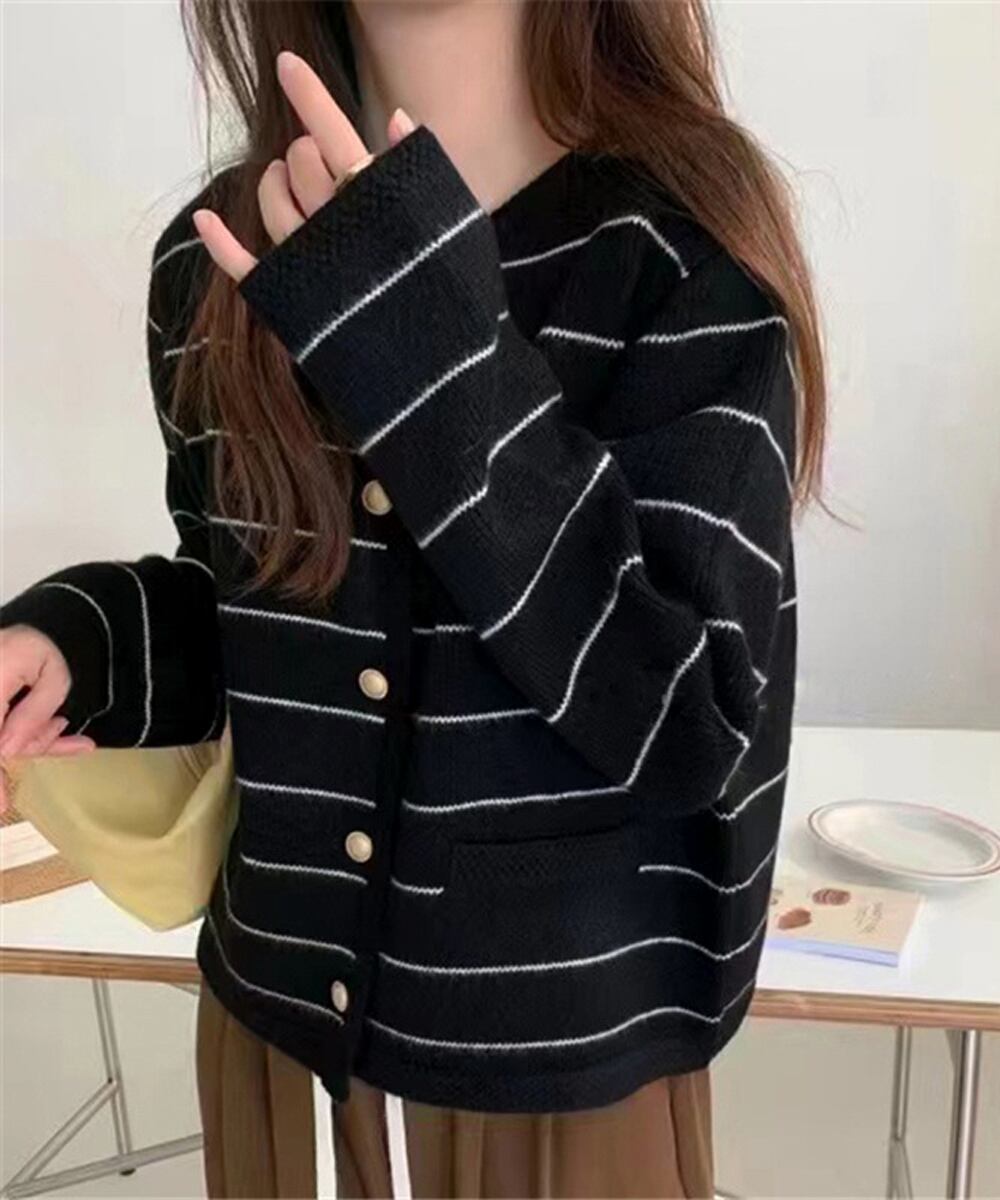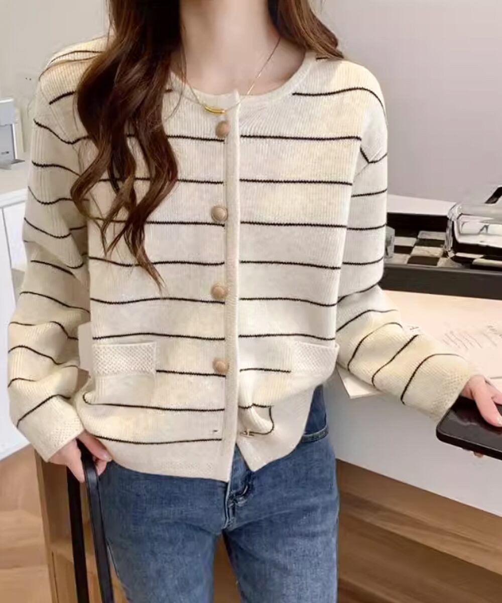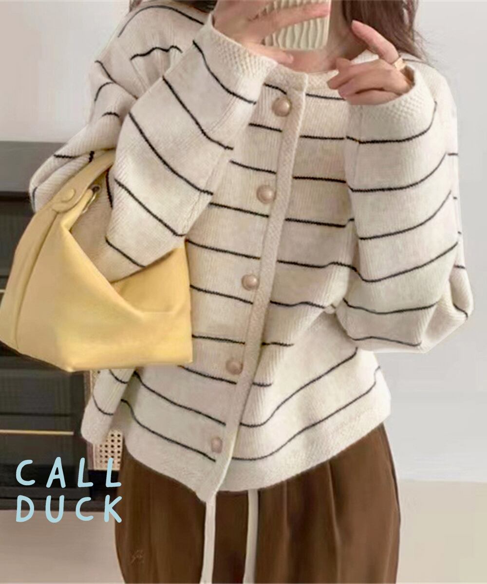 ニット生地に存在感をまろやかにした細ボーダー柄、カジュアルながらも女性らしいきれいめ着こなしに導いてくれるニットカーディガン