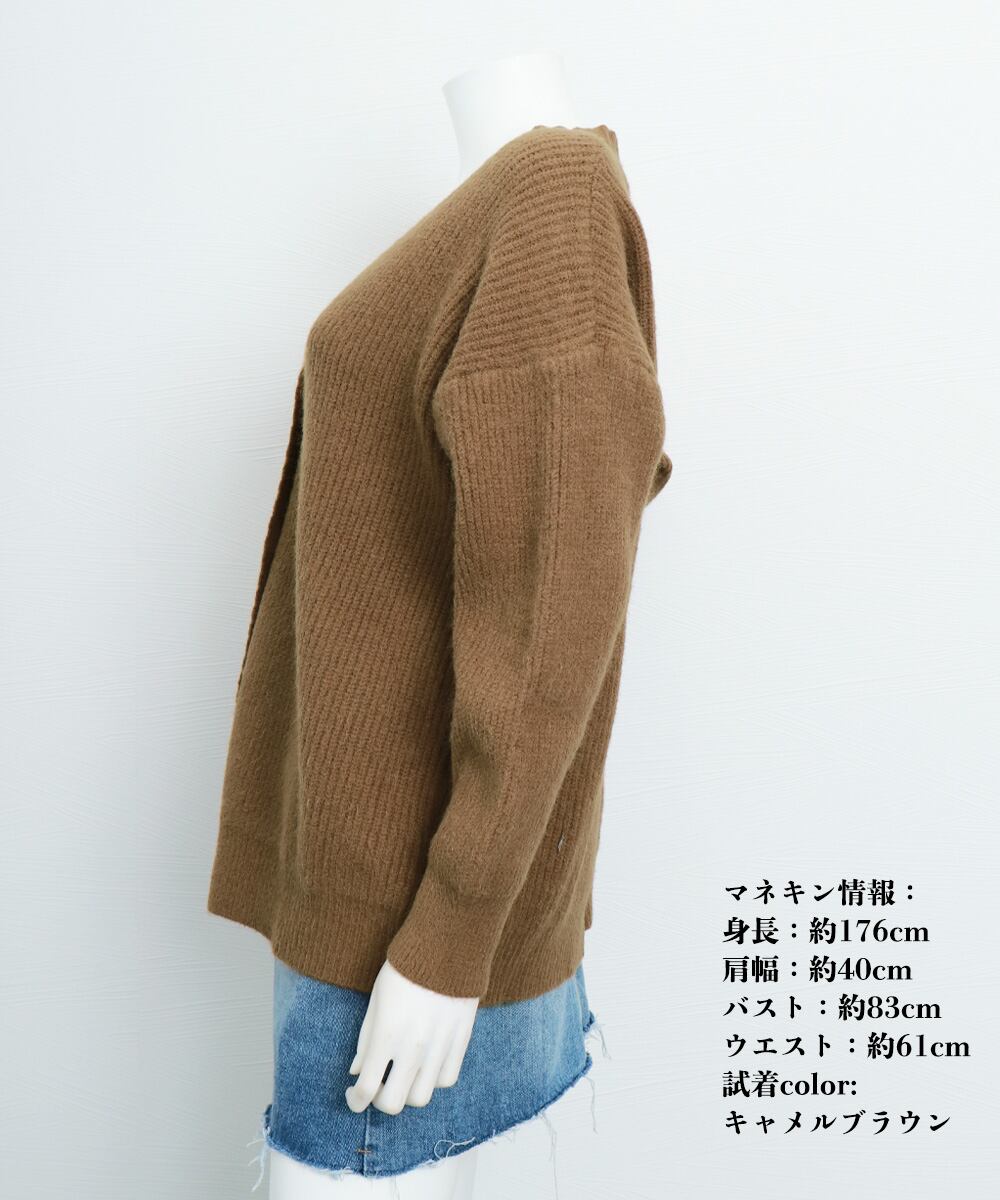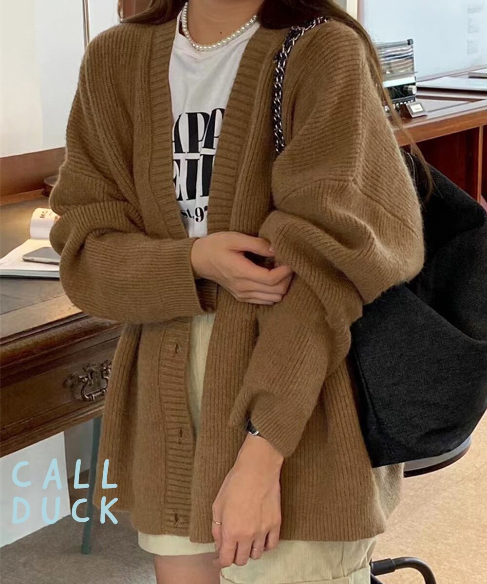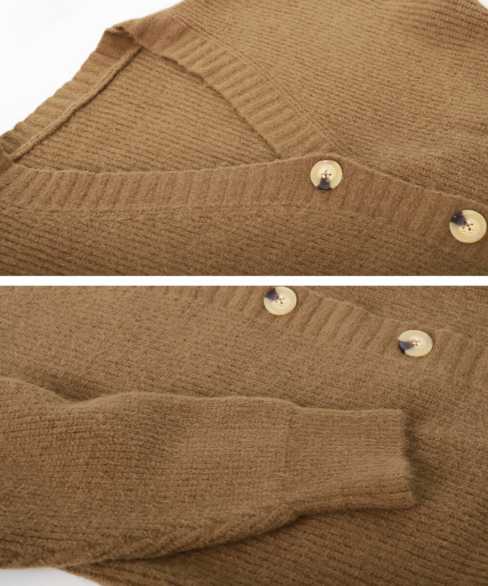 顔周りに程よい抜け感を与えるVネックデザインの長袖ニットカーディガン。
