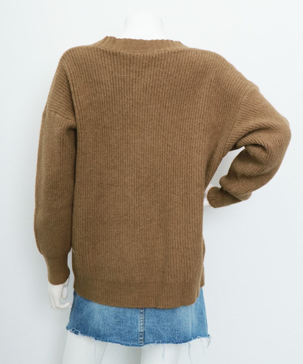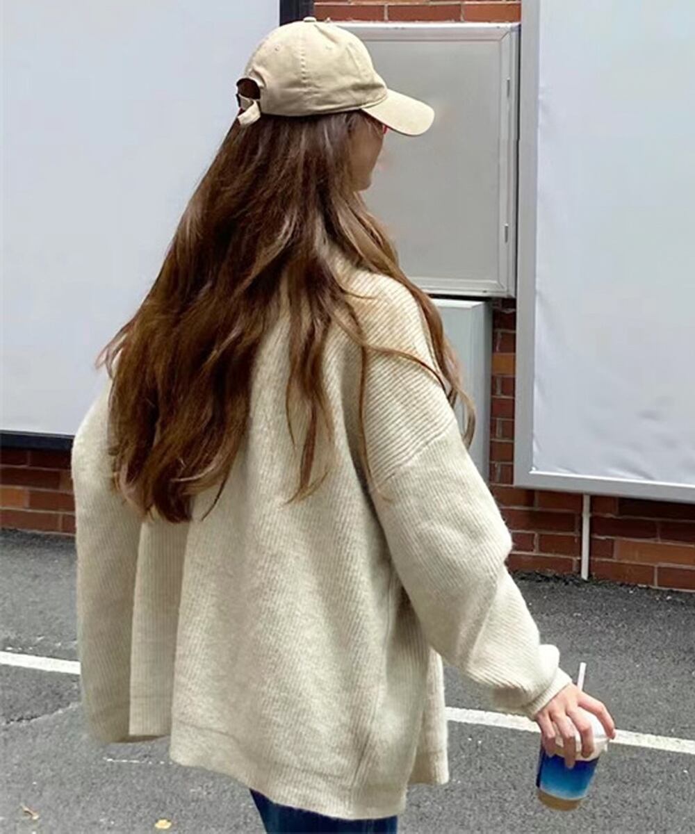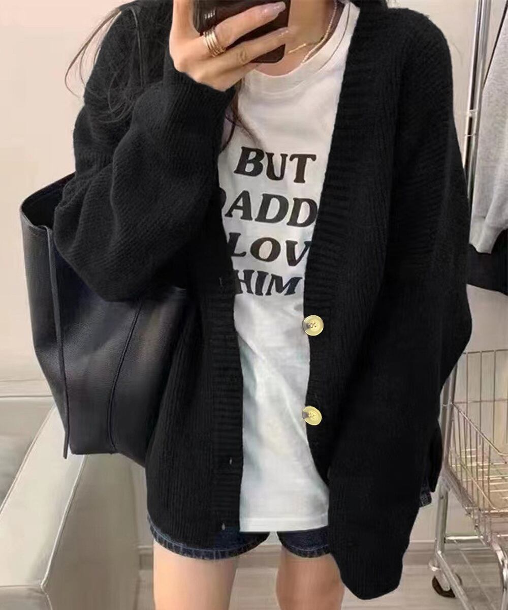 顔周りに程よい抜け感を与えるVネックデザインの長袖ニットカーディガン。