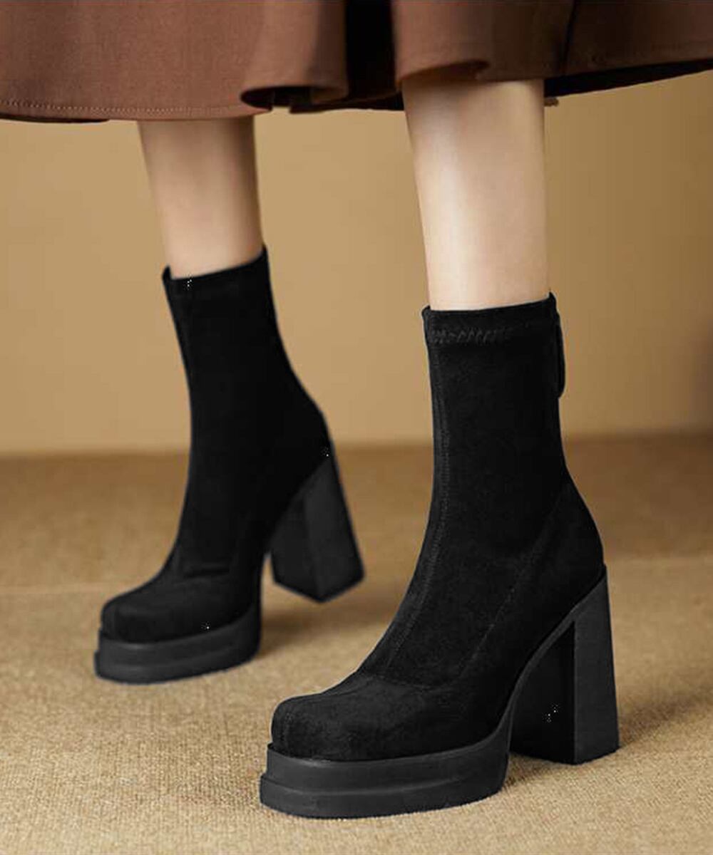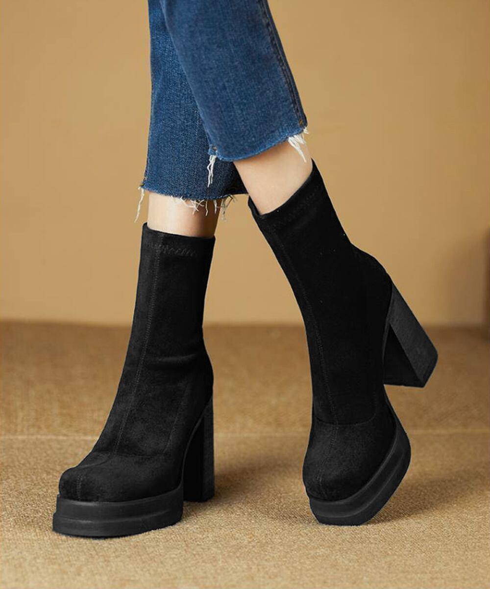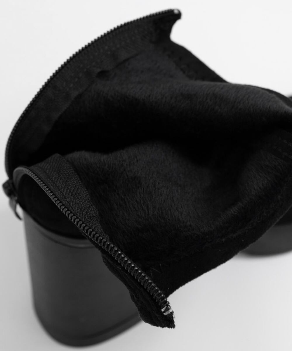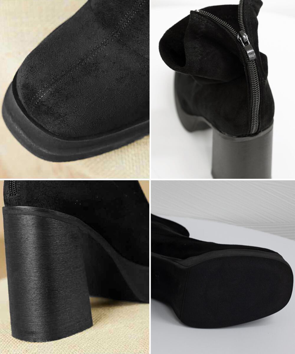 シーズンライクなスエード調素材にエコレザーチャンキーヒールの異素材mix仕様、お洒落だけでなく安定感も抜群の韓国っぽショートブーティ
